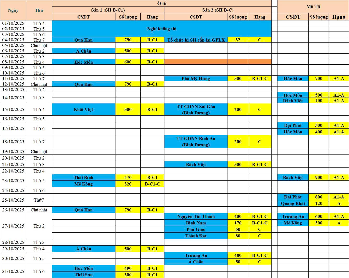Lịch thi sát hạch lái xe trong tháng 10/2025